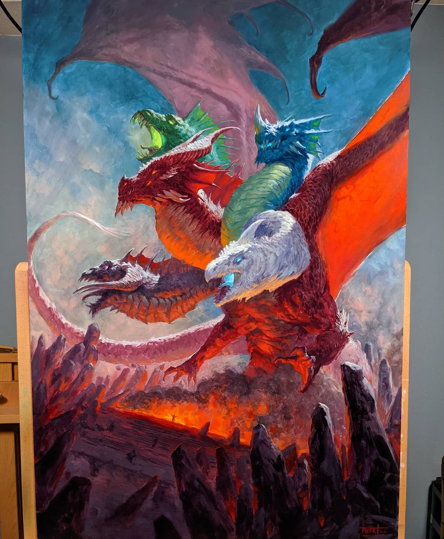 To my surprise & excitement #MagicTheGathering previewed my #Tiamat for the upcoming Adventures in the Forgotten Realms #dungeonsanddragons crossover set. I worked really hard on this set at many levels of production. What do you think, should I sell the painting? AD @zack_stella pic.twitter.com/RNuNdJDXrY
